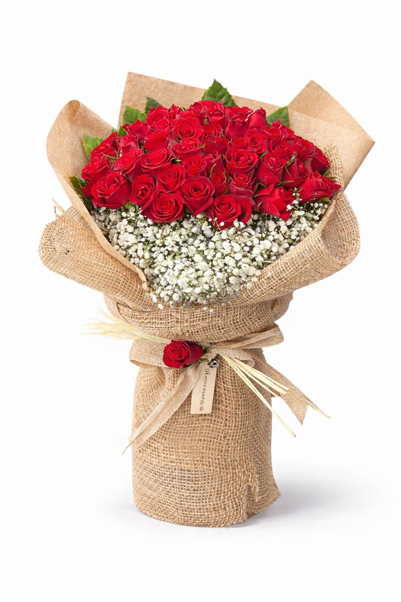 29 güllü buket, taze ve canlı kırmızı güllerin beyaz cipso çiçekleriyle dengeli şekilde harmanlanmasıyla hazırlanır. Doğal dokulu hasır ambalaj, bukete sıcak ve samimi bir karakter kazandırırken; kırmızı güllerin tutkusunu ön plana çıkarır.Kırmızı güllerin aşkı ve asaleti, doğal hasır ambalaj ve beyaz cipso çiçekleriyle zamansız bir şıklığa dönüşüyor.