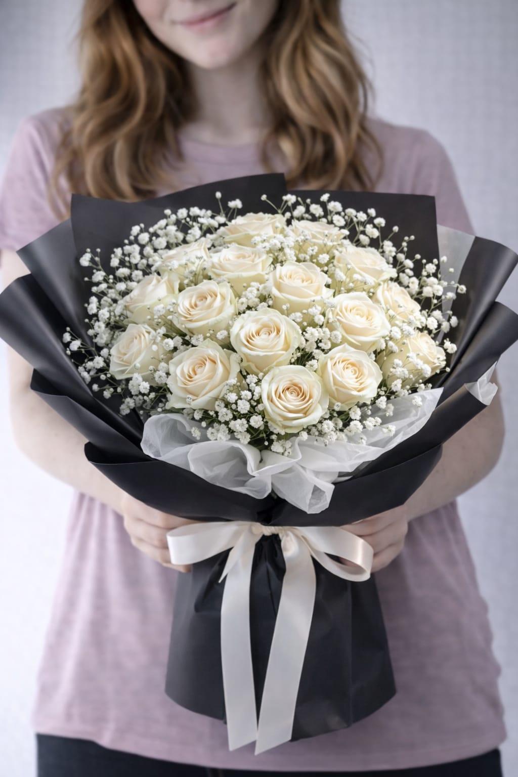 Bu özel aranjman, 25 adet taze beyaz gül ile hazırlanır.