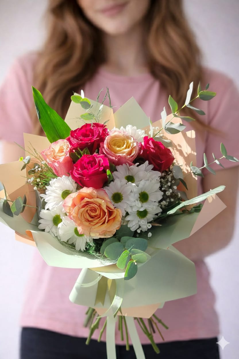 Gül ve Papatyalar, canlı renkli güller ile beyaz papatyaların doğal uyumunu bir araya getirerek hem romantik hem de samimi bir atmosfer oluşturur. Şık ambalajı ve yumuşak ton geçişleri sayesinde modern ve zarif bir görünüm sunar.
