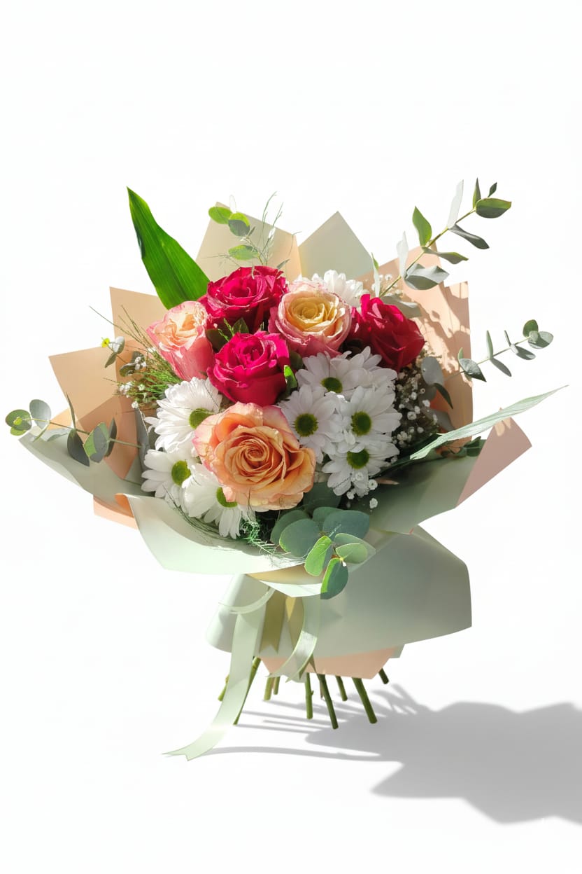 Taze güllerin göz alıcı formu ile papatyaların ferah dokusu birleşerek hacimli ve dikkat çekici bir kompozisyon oluşturur. Uzun süre canlılığını koruyan yapısı sayesinde hem görsel hem duygusal etki bırakır.