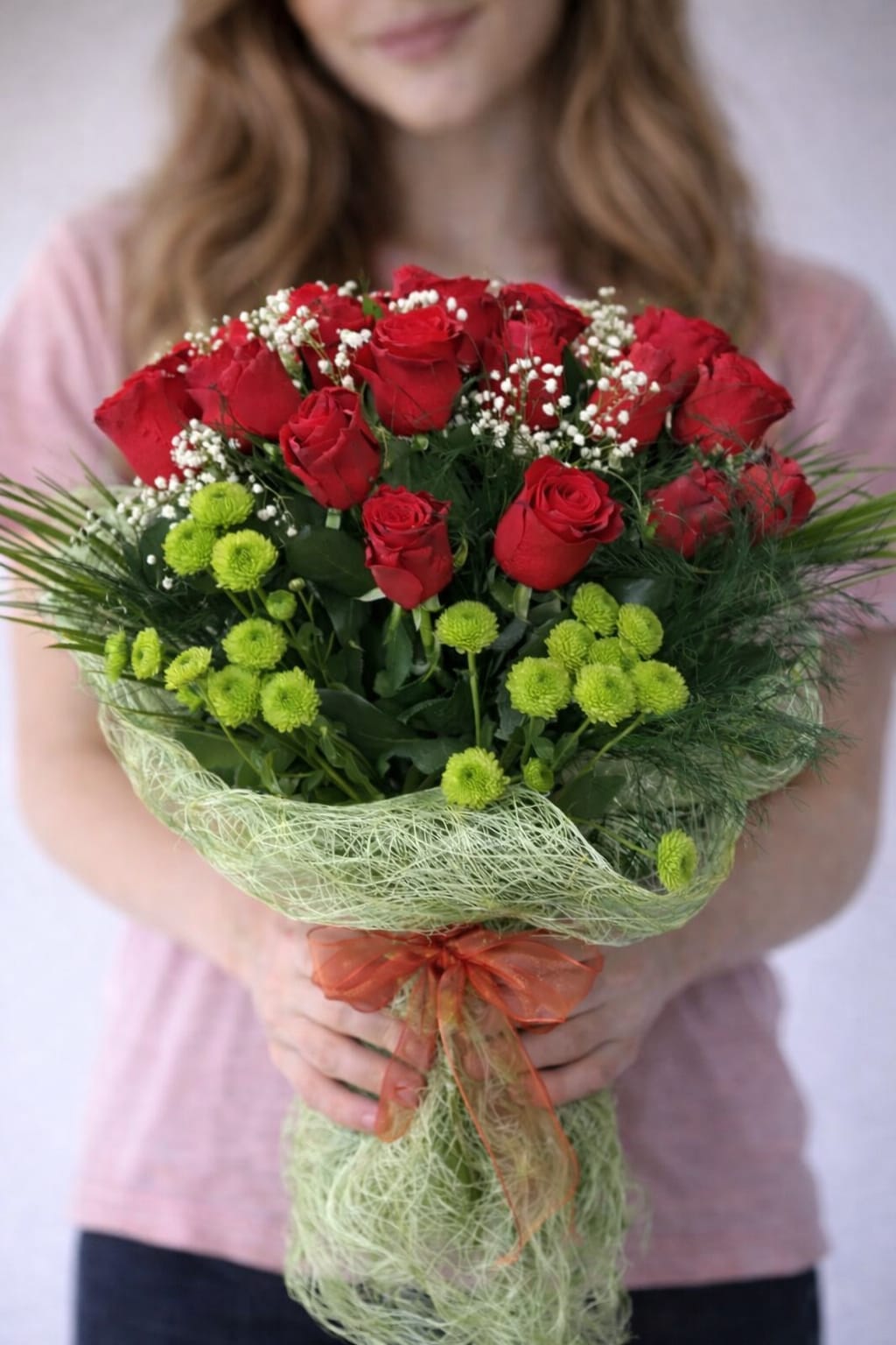 Bu özel buket, 17 adet kırmızı gül ve bukete canlılık katan 5 dal yeşil krizantem ile tamamlanır.