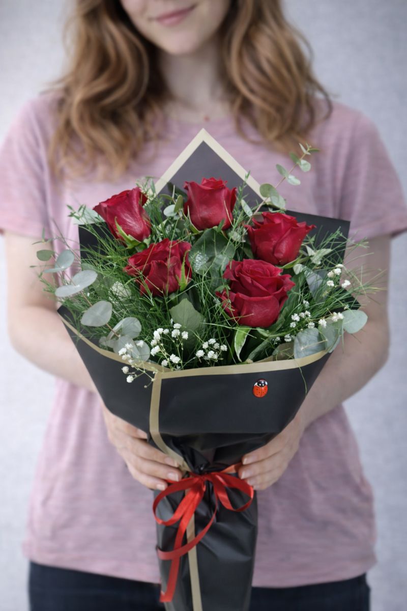 Kırmızı Gül Buketi 5’li canlı ve taze kırmızı güller, modern siyah ambalaj ve zarif yeşillikler ile hazırlanmıştır. Kontrast renk uyumu sayesinde güçlü, karizmatik ve lüks bir etki yaratır.Tutkunun ve aşkın en güçlü ifadesi olan kırmızı güller; siyah ambalajın asil dokunuşuyla etkileyici ve iddialı bir sunum oluşturur.