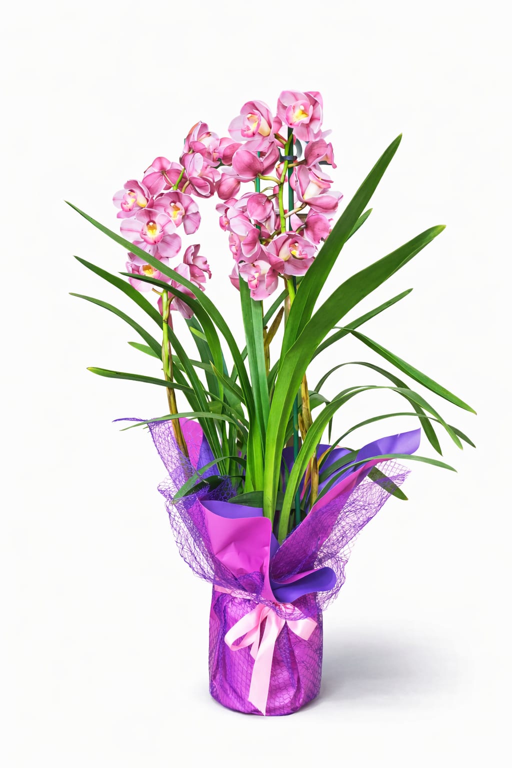 Pembe Cymbidium orkide; dolgun çiçek salkımları, güçlü yeşil yaprakları ve etkileyici duruşuyla dikkat çeken özel bir orkide türüdür. Mor-pembe tonlardaki şık ambalajı, bitkiye modern ve zarif bir karakter kazandırır.