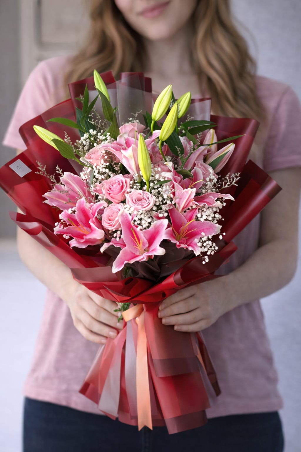 2 dal Pembe lilyum ve 5 adet pembe gülden hazırlanan bu zarif buket, annenize duyduğunuz saf sevgiyi anlatır.