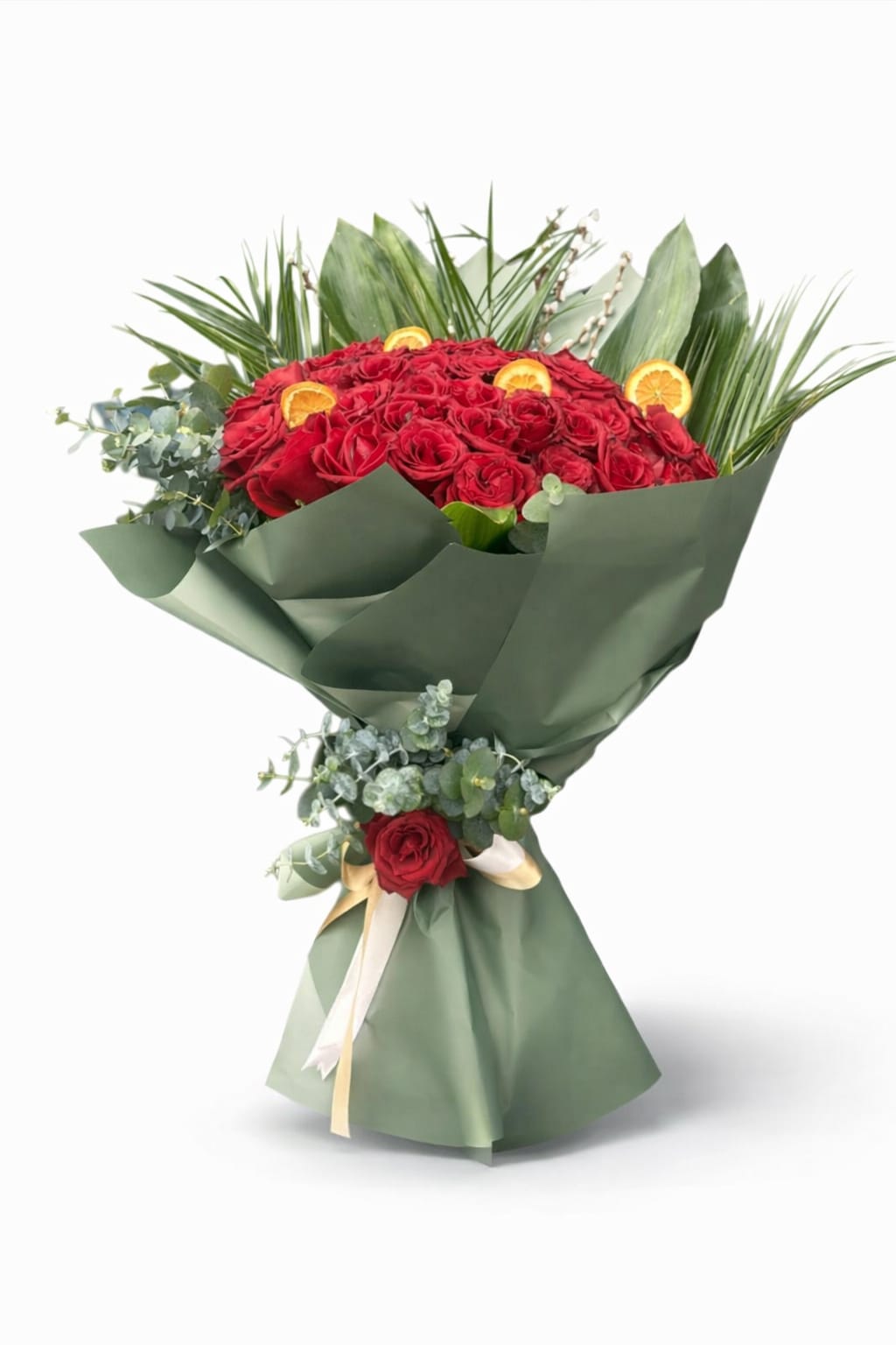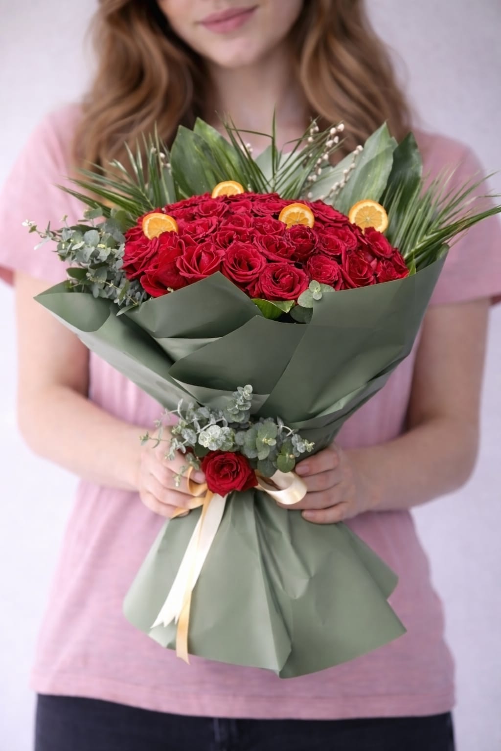 Sevgililer günü 35 gül buketi sevgililerini mutlu etmek isteyenler için hazırlanmıştır;,canlı kırmızı güller, doğal yeşillikler ve dekoratif portakal dilimleriyle hazırlanır. Yeşil tonlardaki modern ambalajı, bukete hem doğal hem de prestijli bir görünüm kazandırır. Günlük taze çiçeklerle özenle hazırlanır.