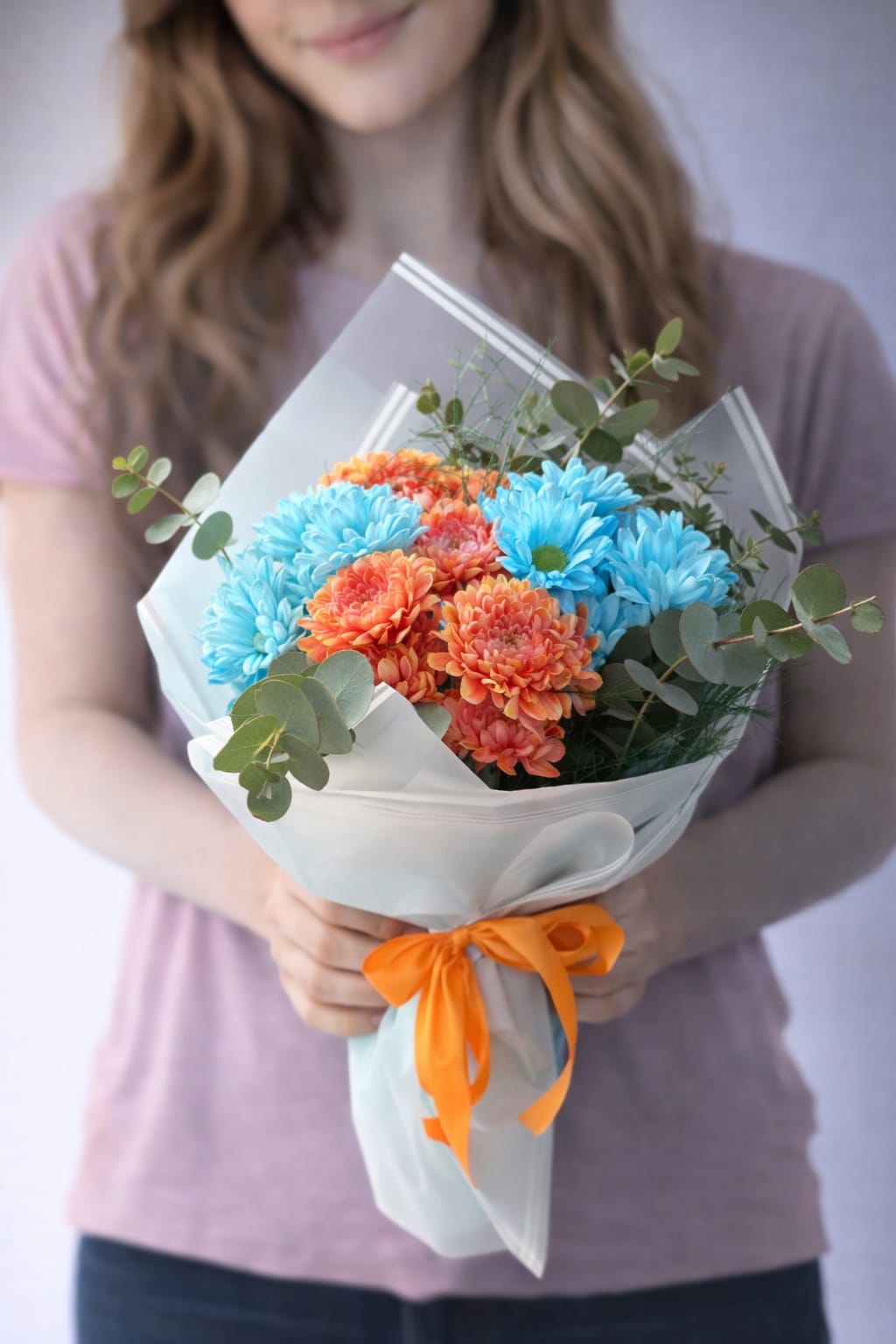 Bu özel buket; taptaze turuncu ve mavi krizantemlerin, doğal yeşilliklerle dengeli biçimde bir araya getirilmesiyle hazırlanır. Şeffaf ambalajı ve turuncu kurdele detayıyla modern, enerjik ve dikkat çekici bir görünüm sunar. Uzman tasarımcılarımız tarafından günlük taze çiçeklerle hazırlanır.